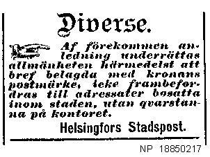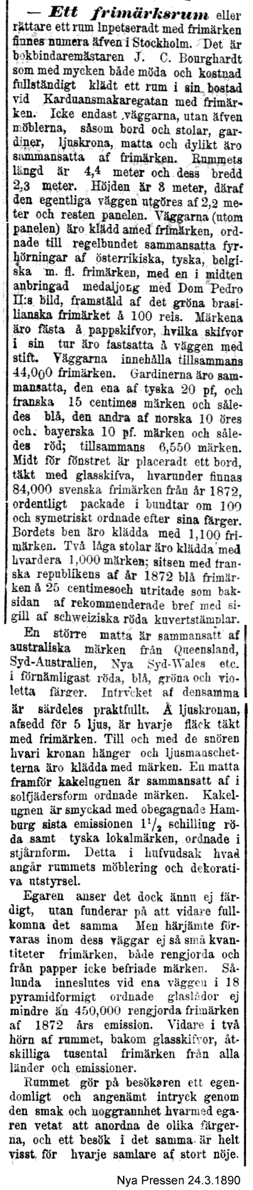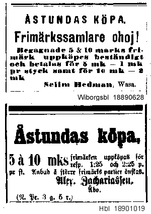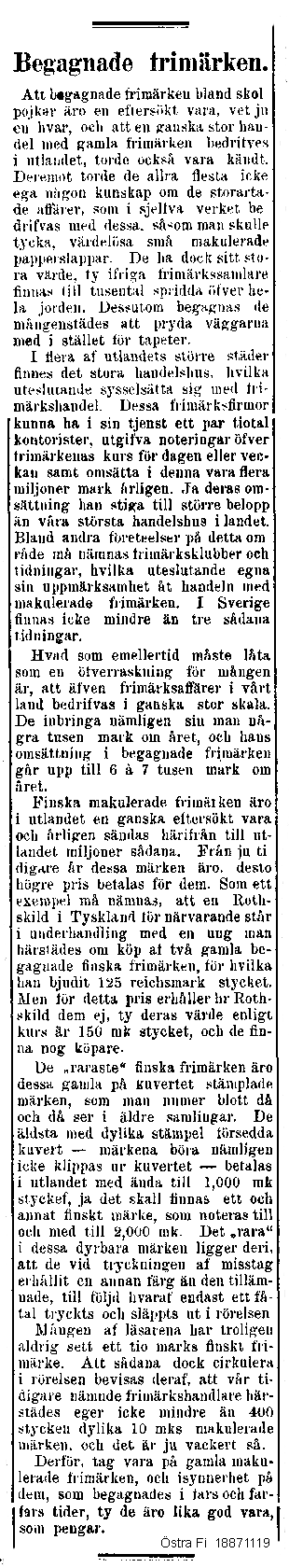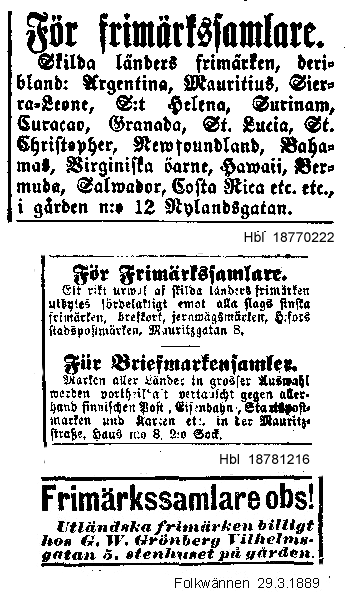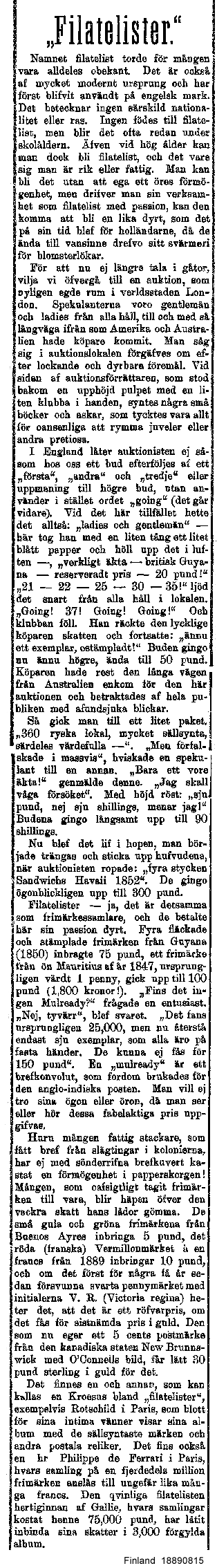 Livlig engelsk frimärksauktion år 1889.(I artikeln nämnda hertiginnan av Galliéra var mor till Philippe de Ferrari.) God efterfrågan på begagnade finska frimärken 1887.
