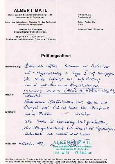 Matl, Albert, 2. Certif. | Austria (incl. PO Levant and Crete), Lombardy-Venetia, Turkey, Japan | Vienna, b. 1924, expert 1963–, BPP 1976, AIEP 1964–, VÖB, [FFE5, PE] |