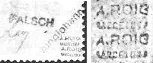 Roig, A., Barcelona, 2 (Catalan: Antoni Roig) | Spain, Europe, Worldwide. Seen on forged eg. Cracow 1919 and Japanese stamps | Dr. Antonio Roig Soler, Barcelona 1943, 1881–1970, dealer, AIEP 1954–70, his mark 2 has been forged. Note |
